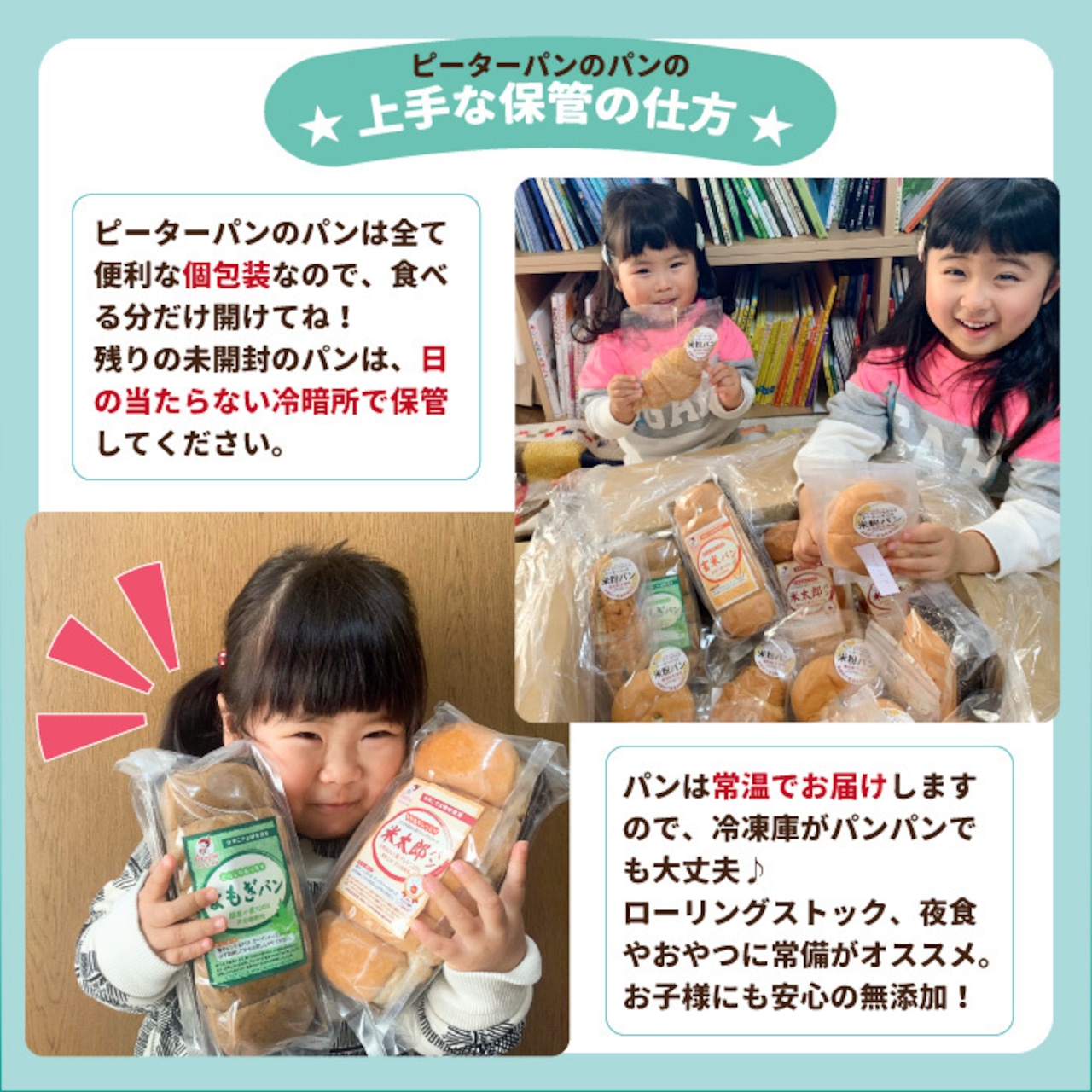 安心の無添加パンを、ピーターパンオリジナル包装で包むことにより、未開封の状態で、常温で約1か月日持ちするロングライフパンです。